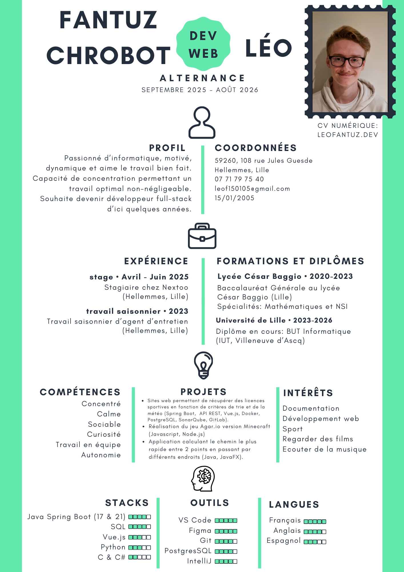 Étudiant en 3ème année de BUT Informatique à Villeneuve d'Ascq. Créateur d'expériences numériques, actuellement développeur Full-Stack en alternance chez Nextoo.